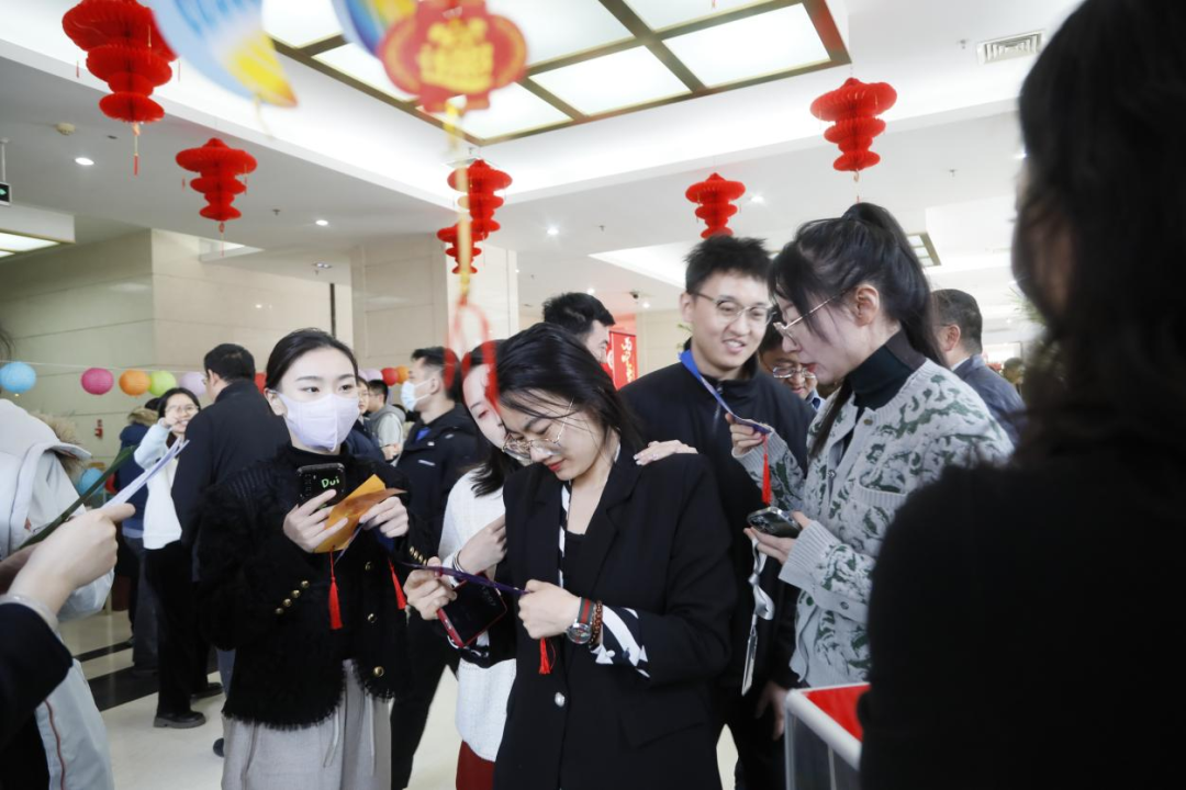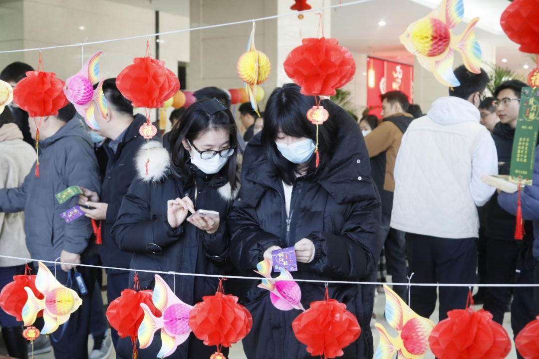 工作人员在集团一楼大厅北侧精心布置了各色灯笼、条幅,悬挂了600多条元宵灯谜,内容丰富多样,既具娱乐性,又具知识性。活动现场,热闹、温馨、其乐融融,大家三五成群,热烈地讨论着灯谜内容,每个人脸上都洋溢着开心的笑容。“红嘴绿鹦哥,吃了营养多”“点点蝌蚪水边游”……一条条妙趣横生、内容丰富的谜题,让大家在赏灯猜谜的同时,享受着传统文化带来的乐趣。