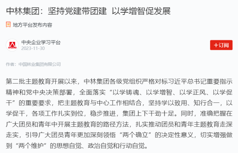 赞!中央主题教育官网、“学习强国”连续刊发中林集团主题教育成果成效