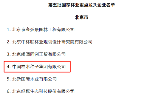 近日,国家林业和草原局公布第五批国家林业重点龙头企业名单,中林集团所属中国林木种子集团有限公司、 福建省永安林业(集团)股份有限公司、重庆市林业投资开发有限责任公司三家林业公司榜上有名。