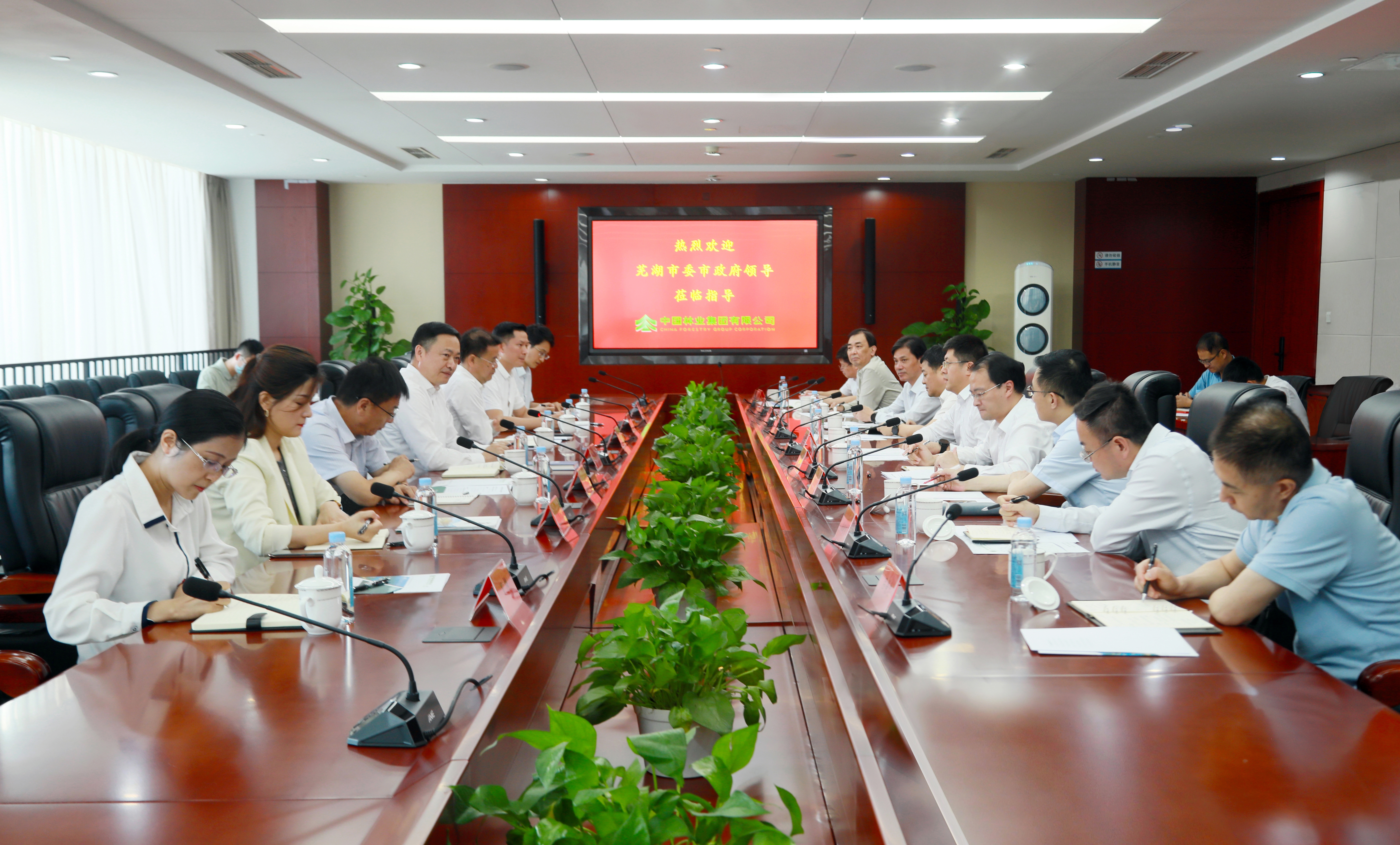 单向前简要介绍芜湖市的产业情况和发展战略。单向前表示,近年来,芜湖市始终以“产业兴,生态美,百姓富”为目标,着眼林业经济、生态效益,在乡村振兴中大力发展林业产业。中林集团是林业行业唯一央企和国家生态文明建设的主力军、国家队,在专业领域具有雄厚实力和丰富经验。双方在林业生态和产业建设等方面有诸多契合点,希望中林集团充分发挥全产业链优势,围绕国家储备林建设、碳汇经营开发等领域与芜湖深化合作,共同推动芜湖林业产业高质量发展。