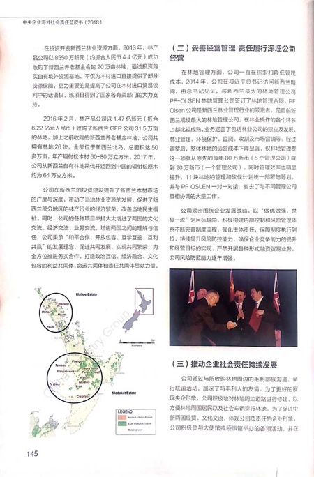 集团公司编写的《合理利用资源 引领行业发展》被收录本年度蓝皮书。编委会充分肯定了集团所属林产品公司积极响应习近平总书记提出的“一带一路”倡议,秉承“共商、共享、共建”原则,遵循市场规律和国际通行规则,依法合规开展国际化经营,不仅促进了当地林业行业健康发展,改善当地民生福祉,更有效提高了中国林业企业木材进口贸易谈判中的话语权,为促进全球森林经营可持续发展做出了重要贡献。