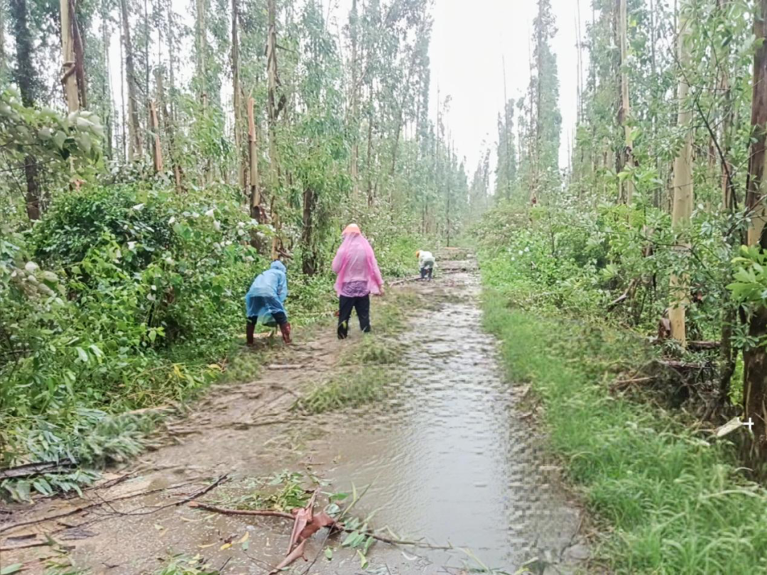各林队管理人员冒着雨不畏艰难穿梭在各个林班,在受损的乡道中清理路障,利用电锯、镰刀等清理倒伏的林木,排除安全隐患,以最快的速度恢复正常的生活生产秩序。
