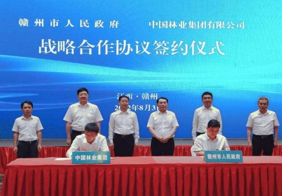 "8月3日,中林集团与赣州市人民政府签署战略合作协议。中林集团党委委员、副总经理李留彬,赣州市委副书记熊运浪出席仪式。双方表示,将在国家储备林建设、林业碳汇、油茶产业、竹产业和森林旅游(康养)等方面加