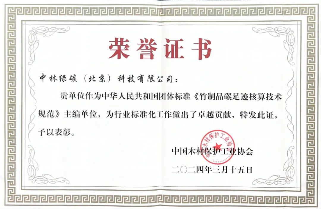 同时,中林集团积极参与我国竹产业标准的编制工作,主编了《竹制品碳足迹核算技术规范》标准并荣获了中国木材保护工业协会表彰。