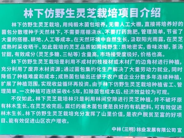 中林三明公司积极探索共享林下经营模式,充分利用林下中药材多花黄精种植先驱经验,于2023年5月中旬在将乐县常口村多花黄精种植基地套种仿野生椴木紫灵芝,打造了集多元化于一体的小型循环生态系统基地,共完成种植3000余株,以点带面,将逐步扩大种植面积,成为辐射周边地区的示范基地。现种植的仿野生椴木紫灵芝部分已进入成熟期,后续将陆续开展灵芝的采收工作。