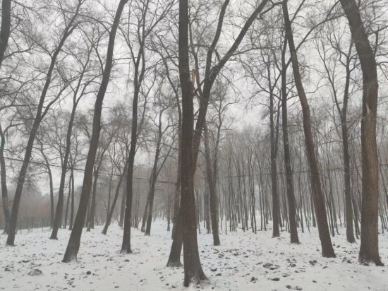 在中林林碳公司丰宁县林业碳汇项目土地中,成片的大树在雪地中矗立,洁白的雪花覆盖在树枝上,与天空中洒下的阳光相互辉映。