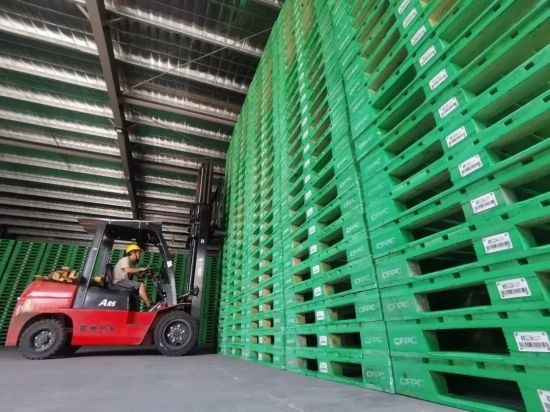 产业园仓库内的木托盘整齐码放,白色塑料片内有智能芯片