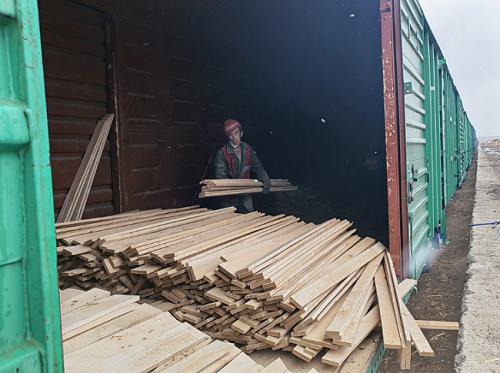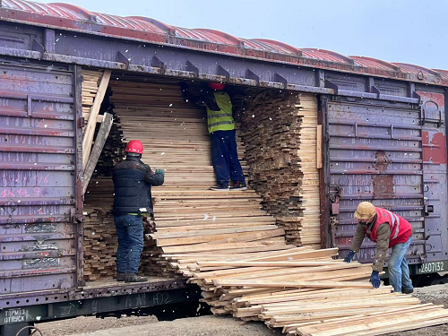 天气突变 坚持作业 4月19日,内蒙古满洲里下了一场春雪,林场集团所属满洲里伊利托基地现场部工人冒着风雪,在宽轨1道,执行俄罗斯棚车散装木材卸车任务。工人清晨5点开工,经过一天紧张有序的作业,晚上19点圆满完成57节车厢的卸车任务。(摄影:张震)