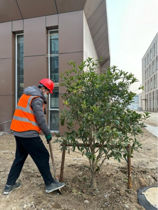 徐州中林一线工人正在进行园区全面绿化,灌木种植,适当疏剪枝叶后,将树苗扶正栽种到坑穴中,填充土壤,浇定根水,保障绿化工作高效完成。