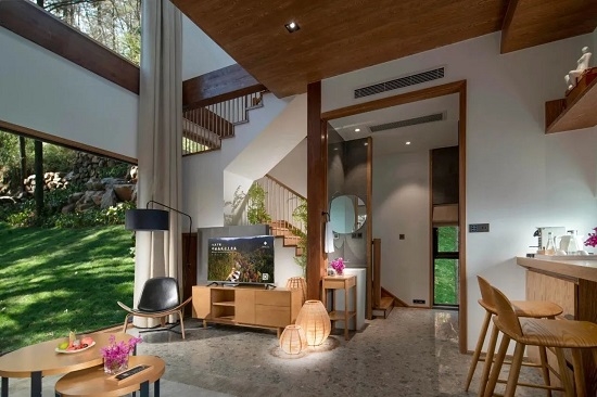 酒店将体验式度假与生态环境完美融合,森林覆盖率达90%以上,负氧离子含量比城市高出1100多倍。推开窗便能置身于原始纯粹的大自然中。依托天然“曲水流觞”式生态地貌,沿线打造5大主题度假别墅群。隐世山林之中,潺潺溪水伴随着悦耳鸟鸣,仿佛与世隔绝,于自然奢华中寻求心灵的治愈。