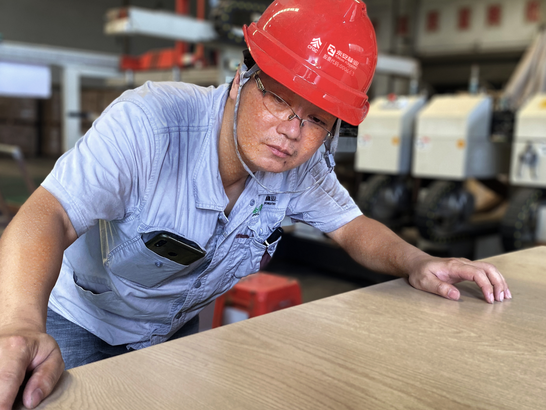 永林蓝豹家居工厂生产一线,工人张维吉正在检验板材,汗滴从脸上滑落,但检验的标准和要求不会因此降低。