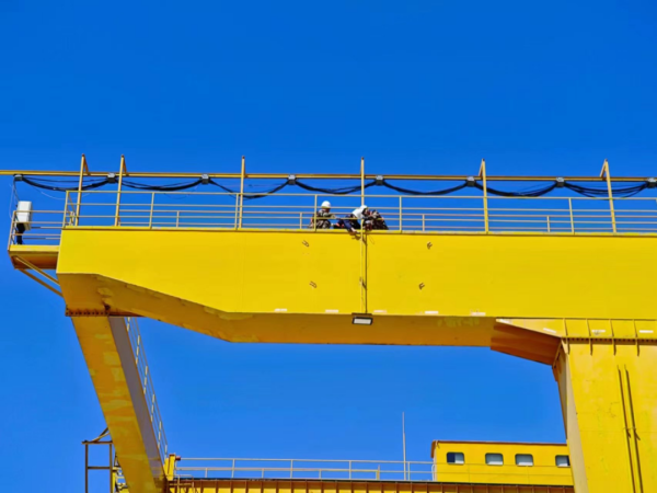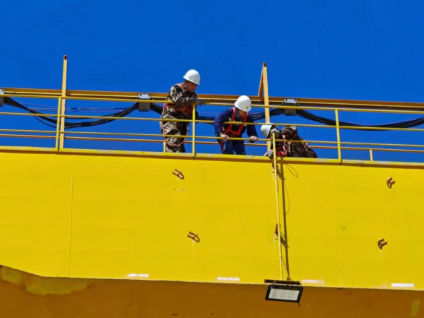 7月18日,工程部刘富强、于长胜和孙东洋登上相当于6层楼高的龙门吊,系上安全绳做好安全防护,开始了更换龙门吊照明灯操作,由1人掌住灯杆,另外2人相互配合把沉甸甸的灯头拽上来,凭借积累的维修经验和熟练的技术,他们顺利地更换了照明灯,将灯杆复位通电检查确认无误之后,3人撤离现场。(摄影:任明哲)