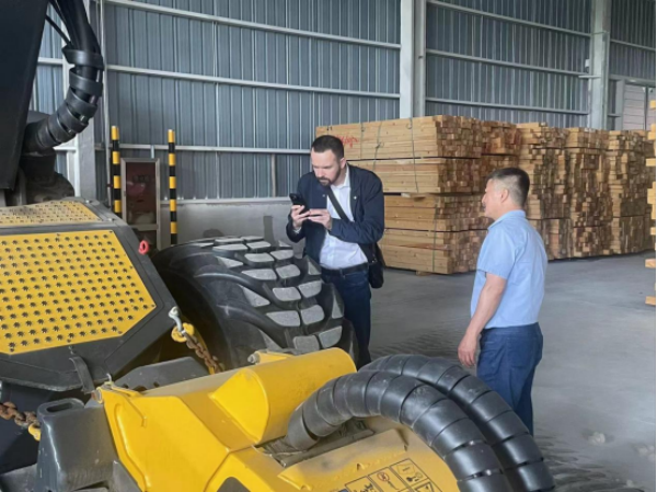 联通国际 助企发展 林场集团所属徐州中林贸易部邀请国外贸易商前来考察伐木设备,公司业务人员对芬兰产庞赛采伐机的锯断、截断、去皮、粗加工、装载运输等功能和操作方法进行详细讲解,得到了外商的好评,为达成合作意向,推动公司木材采伐设备出口,进一步拓展国际业务发挥了积极作用。(摄影:刘博文)