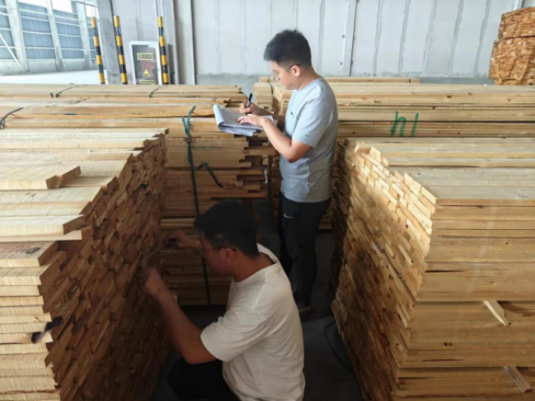 精打细算 心中有称 林场集团所属徐州中林贸易部人员正在对散装板材重新检尺,准确算出体积,严格做好木材管理,杜绝“缺斤少两”货品出库,做到公平贸易。(摄影:刘博文)