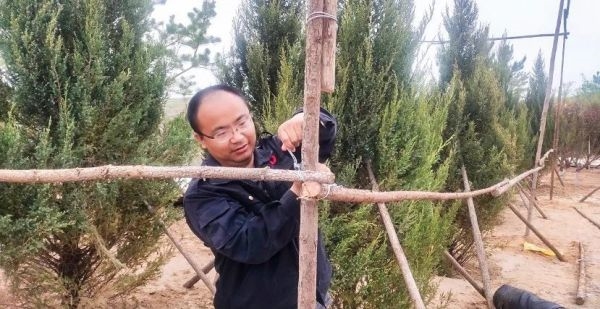 生态修复 护绿成林 林场集团所属中林生态环境科技有限公司一线员工正在项目现场搭建苗木防晒网支架,夏季对新栽苗木和不耐旱苗木都需加装防晒网,有效阻挡太阳的直射,保护苗木不被晒伤,保证苗木成活。(摄影:张旭)