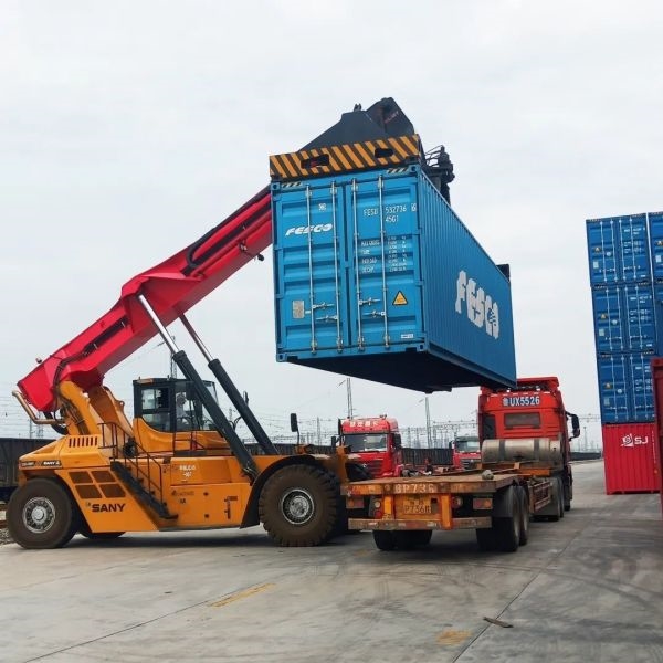 林场集团所属西安中林国铁物流现场部吊车司机(装货员)在货运车辆到达后,将堆垛在储货位的集装箱安全准确装载到车厢,操作过程中,装货员需确认集装箱稳固安全地吊起,鸣笛示意车辆到达装货位,两车驾驶员密切配合,保障了人员、集装箱、货车的安全。(摄影:杨霜)