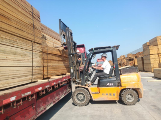 严格把关 安全生产 林场集团所属西安中林国铁物流的叉车司机(装车员)根据客户选材的种类和规格,从货场不同木材堆垛中,找到对应品类,叉取木材运送到货车上,在不超重、不超高的范围之内合理装车摆放,确保货车运输途中木材安全。(摄影:杨霜)