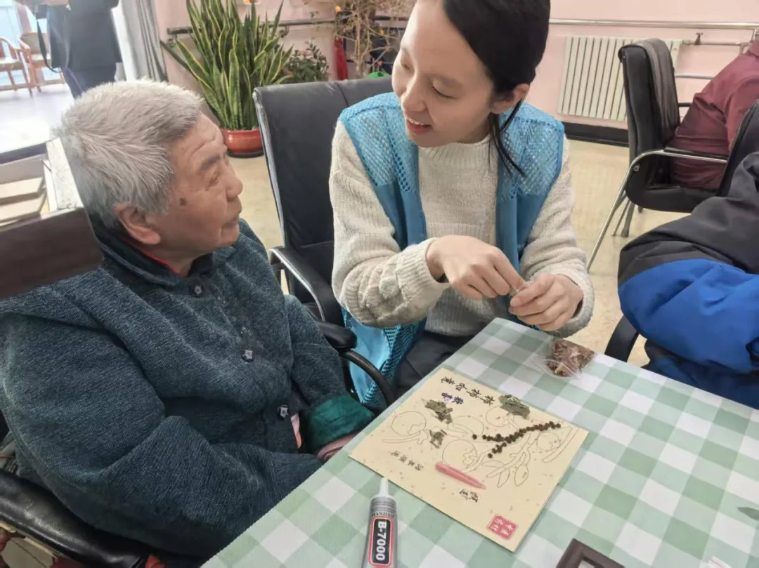 志愿者们一早到达羊坊店敬老院,迅速分工、耐心引导,将手工材料有序分发到每位老人手中,一场充满创意与温情的粘贴手工活动正式开启。志愿者们围在老人身边,一对一贴心指导,考虑到部分老人手部灵活度不足、视力不佳,志愿者们手把手协助老人涂抹胶水、摆放材料,贴出了创意十足的简易风景贴画,每一个步骤都讲解细致、示范到位,全程轻声鼓励、耐心陪伴,充分照顾到每位老人的节奏。老人们兴致高涨,认真投入粘贴创作,现场欢声笑语不断,指尖翻飞间,一幅幅充满心意的粘贴手工作品逐渐成型。
